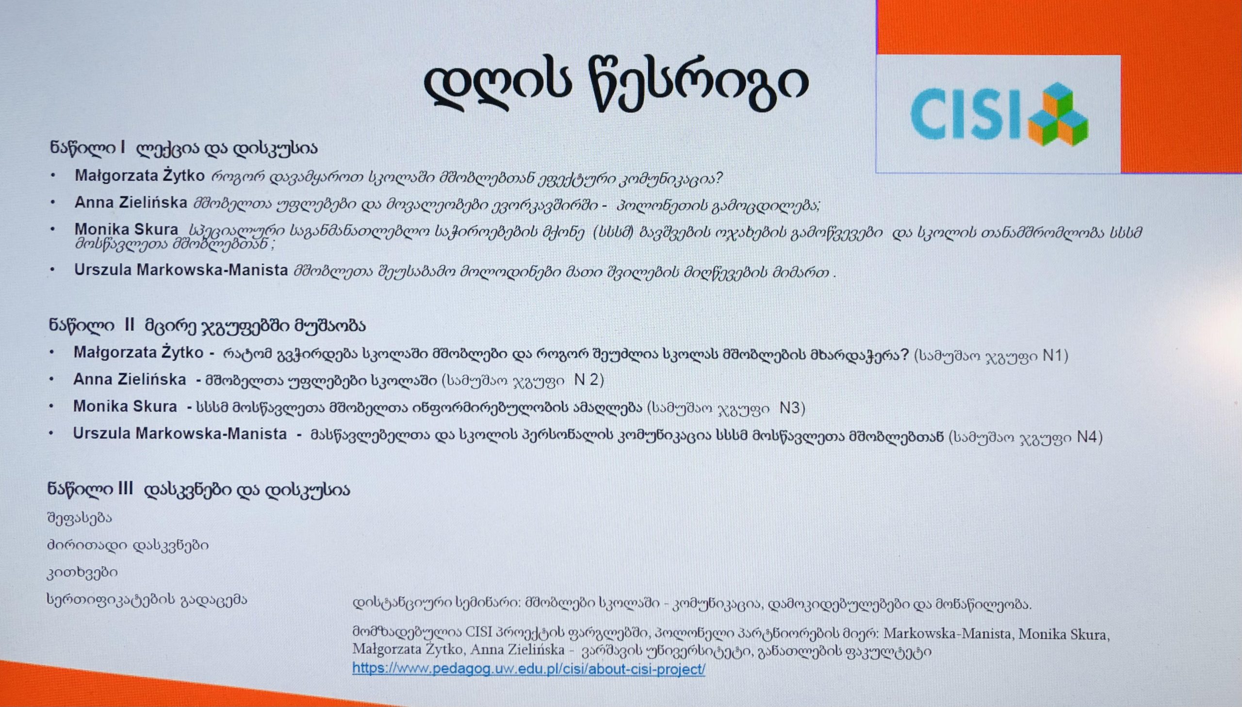 In May 2021, the Polish team conducted an online workshop for teachers and educators: „PARENTS AT SCHOOL – COMMUNICATION, RELATIONSHIPS, CONTRIBUTION”, developed within this project. The workshop was attended by principals and teachers from schools in Georgia.