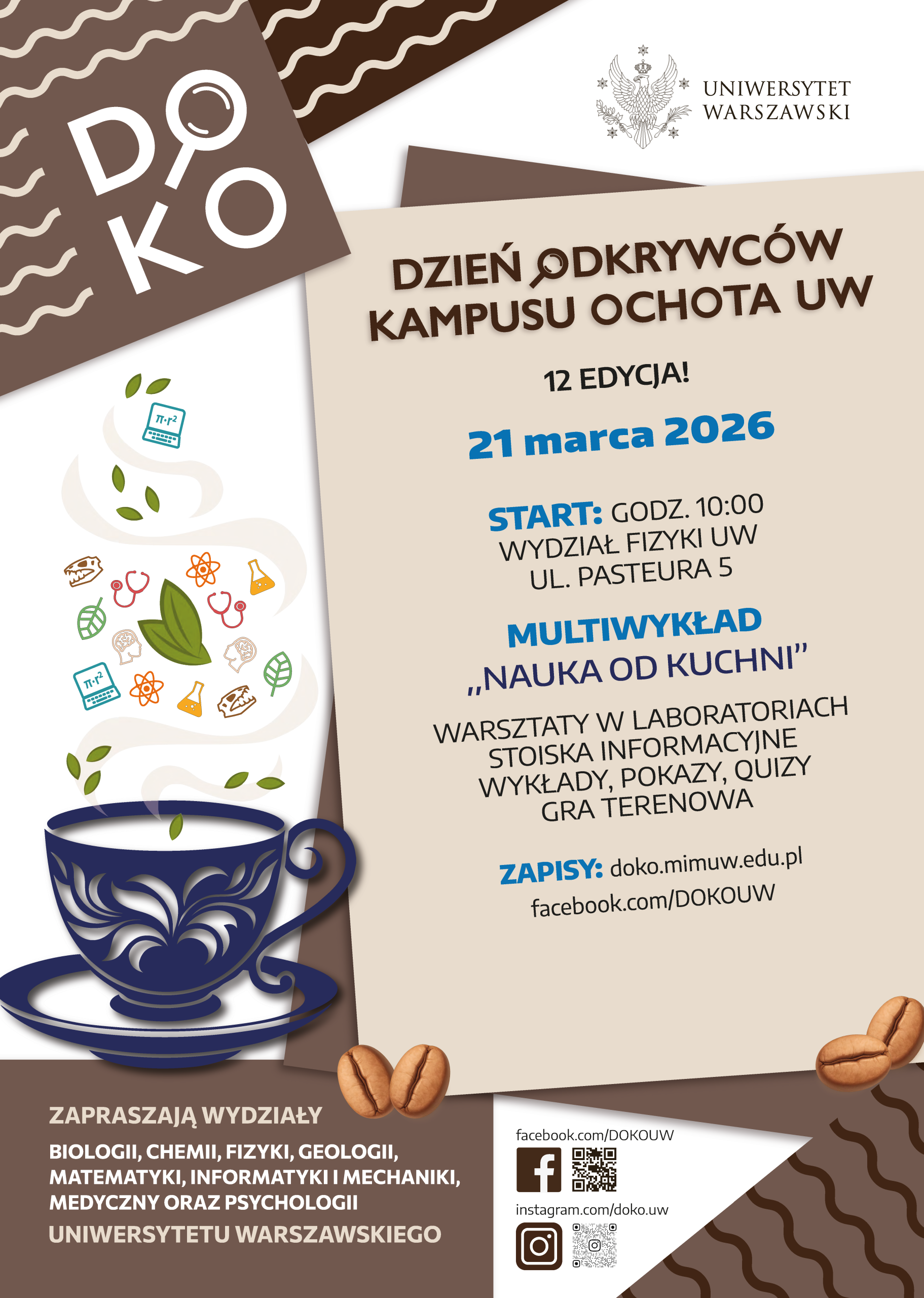 W imieniu wydziałów Kampusu Ochota, serdecznie zapraszamy na wydarzenie DOKO’2026 – Dzień Odkrywców Kampusu Ochota, który odbędzie się 21 marca w sobotę w godzinach 10:00-16:30 (aula 0.03, Wydział Fizyki UW, ul. Pasteura 5). Jest to 12 edycja wspólnego przedsięwzięcia wydziałów: Biologii, Chemii, Fizyki, Geologii, Medycznego, Psychologii oraz Matematyki, Informatyki i Matematyki we współpracy z CNBCh, CeNT, ŚLCJ, MISMaP i UCBS.